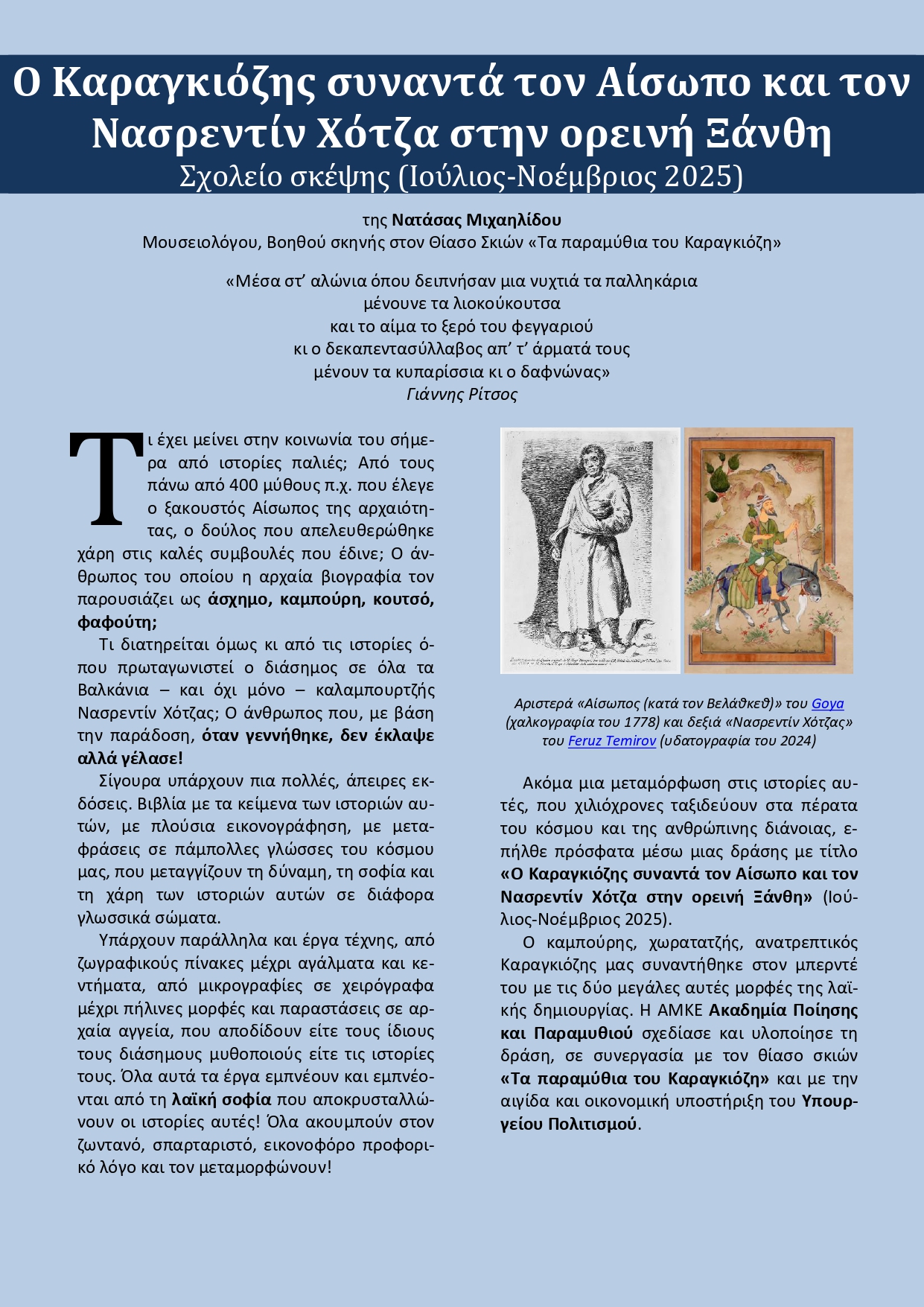 Ακόμα μια μεταμόρφωση στις ιστορίες αυτές, που χιλιόχρονες ταξιδεύουν στα πέρατα του κόσμου και της ανθρώπινης διάνοιας, επήλθε πρόσφατα μέσω μιας δράσης με τίτλο «Ο Καραγκιόζης συναντά τον Αίσωπο και τον Νασρεντίν Χότζα στην ορεινή Ξάνθη» (Ιούλιος-Νοέμβριος 2025).