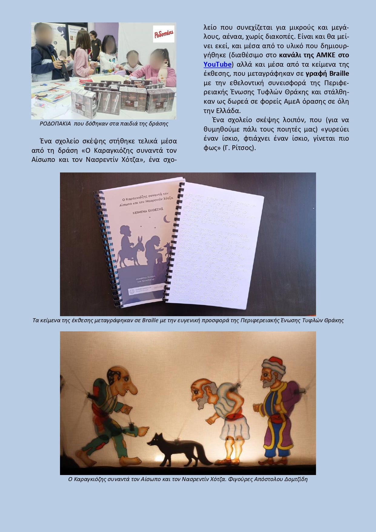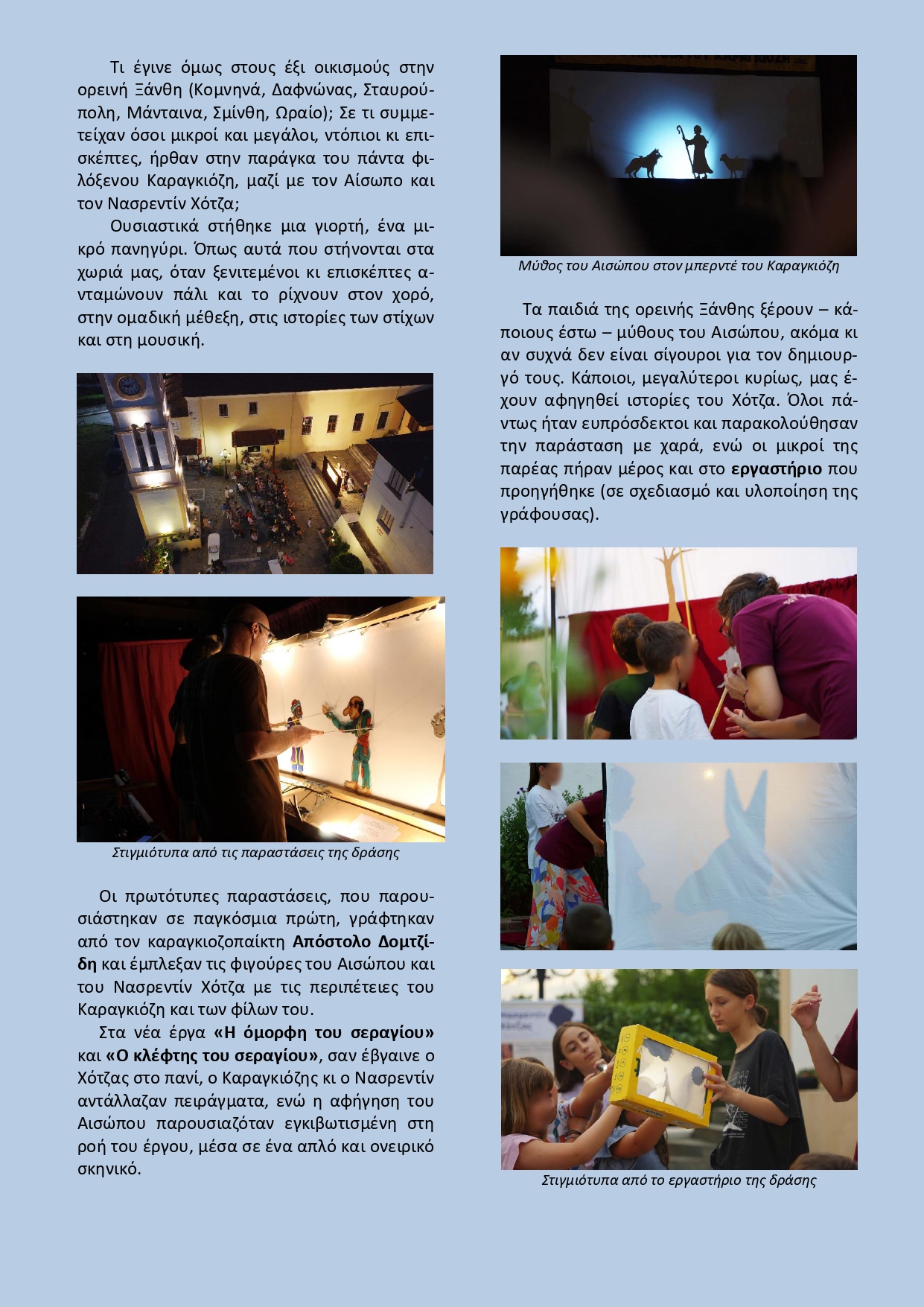 Πήραμε αγάπη από τους συμμετέχοντες που ήρθαν κι αγκάλιασαν τις δράσεις, ταξιδεύοντας ακόμα και χιλιόμετρα, για να δουν τη μεταφερόμενη έκθεση για τον Αίσωπο και τον Νασρεντίν Χότζα, για να πάρουν δωρεάν μια φιγούρα του Καραγκιόζη και μια νέα έκδοση με το κείμενο της παράστασης «Η όμορφη του σεραγίου», που τυπώθηκε σε μορφή φυλλαδίου, όπως παλιά.